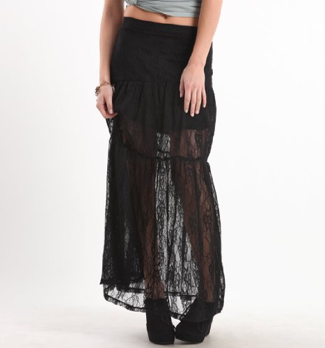 This lace infused maxi skirt has a mini black skirt lining for a super chic and high-fashion look. The flowing skirt runs all the way down to the ground so you can show off your sophisticated style. Add this with a pair of your stylish boots or wedges and your trendy image will live on! 39" length. 13" along top hem. Measured from a size small. Model is 59" and wearing a size small.Customer Reviews